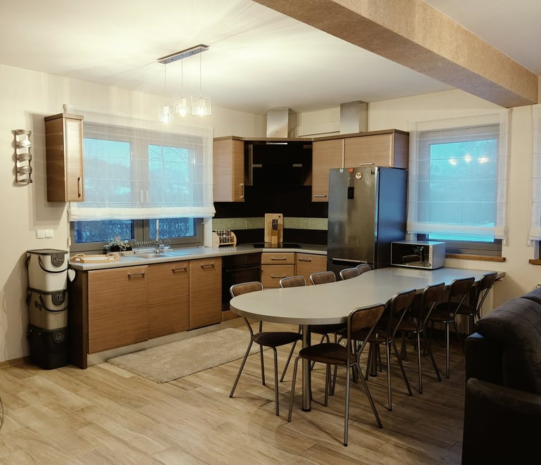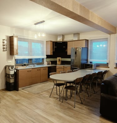 🏠 Strefa wypoczynkowa Komfortowy, w pełni wyposażony dom dla 10 osób — idealny na spokojne poranki, wspólne posiłki i regenerację po dniu wrażeń.
